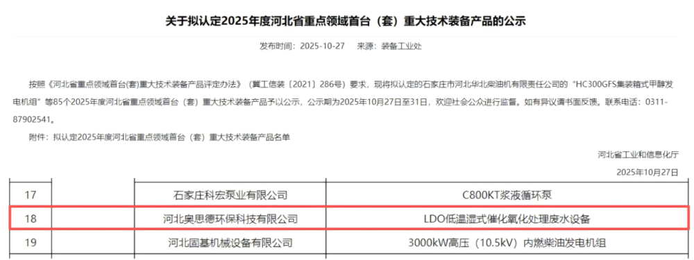 近日,奥思德环保自主研发的 “LDO 低温湿式催化氧化处理废水设备” 成功入选《河北省重点领域首台(套)重大技术装备产品公告目录》,标志着该自研技术通过省级严苛评定,成为河北省工业废水处理领域 “自主创新标杆产品”。